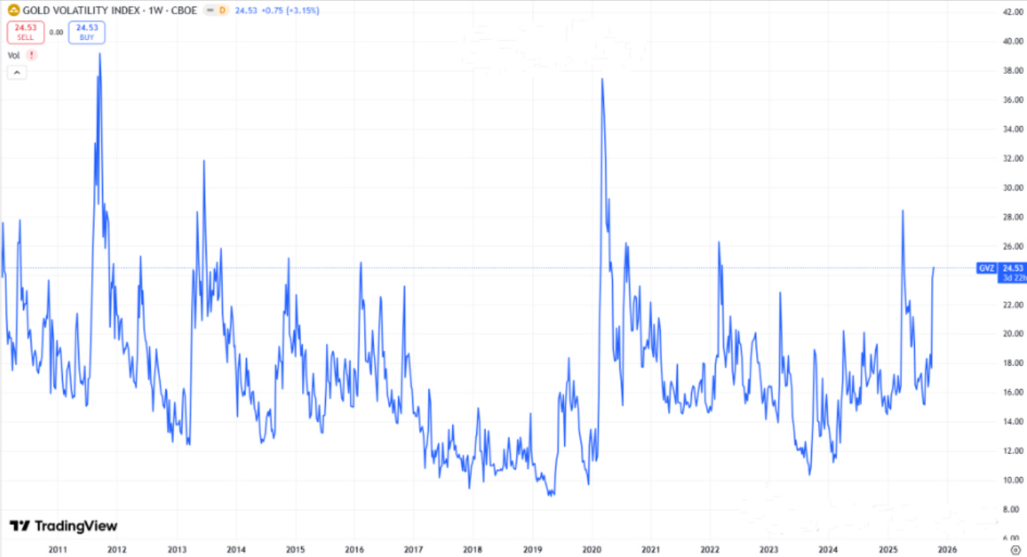 To be more precise, since 2020, today’s gold volatility reading ranks as the third-highest peak, trailing only the period in 2022 when markets widely anticipated aggressive rate hikes from the Federal Reserve, and the shock in April 2025 triggered by tariff policies.